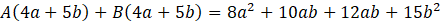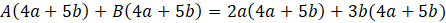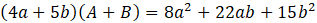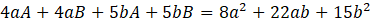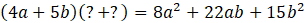 Podstaw za jeden pytajnik A, a za drugi B. Wymnóż nawiasy. Uprość wyrażenie. Wyciągnij A i B przed nawias po prawej stronie równania. Po lewej stronie równania rozdziel 22ab na 10ab i 12ab. Następnie wyciągnij przed nawias 2a i 3b. Zauważ, że A = 2a i B = 3b