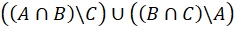 Zapisz oba pola osobno: pierwsze to część wspólna zbiorów A i B, która nie leży w C, a druga to część wspólna zbiorów B i C, która nie leży w A. Niebieski zbiór jest sumą tych dwóch.