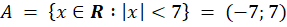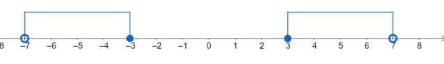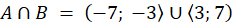Zbiór A to zbiór liczb, które są oddalone o mniej niż 7 od 0 na osi liczbowej, a zbiór B to zbiór liczb, które są oddalone o równo lub ponad 3 od 0 na osi liczbowej. Zapisz oba zbiory jako przedziały lub sumy przedziałów, wyznacz ich iloczyn, a następnie naszkicuj go osi liczbowej.