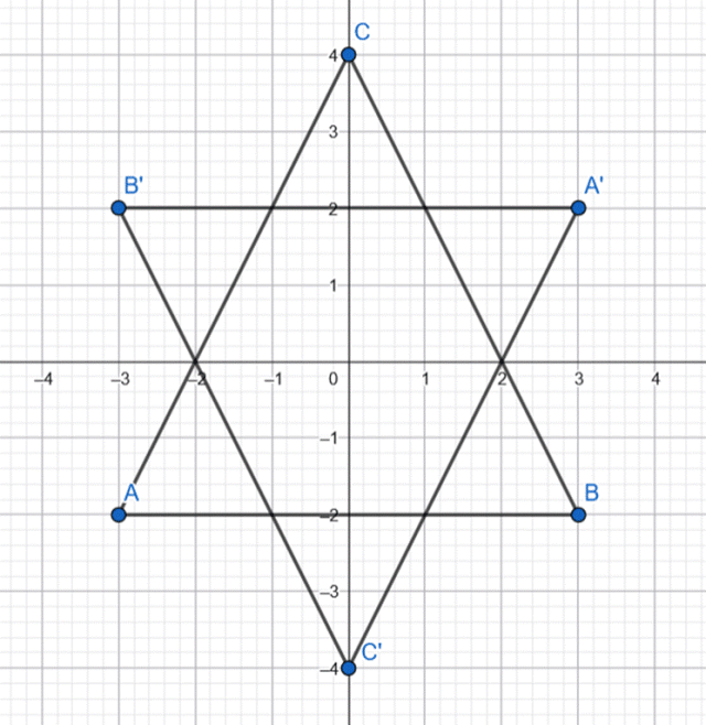 Wyznacz współrzędne wierzchołków trójkąta A’B’C’ i oblicz pole części wspólnej tych trójkątów, jeśli trójkąt A’B’C’ jest symetryczny do trójkąta ABC względem początku układu współrzędnych.