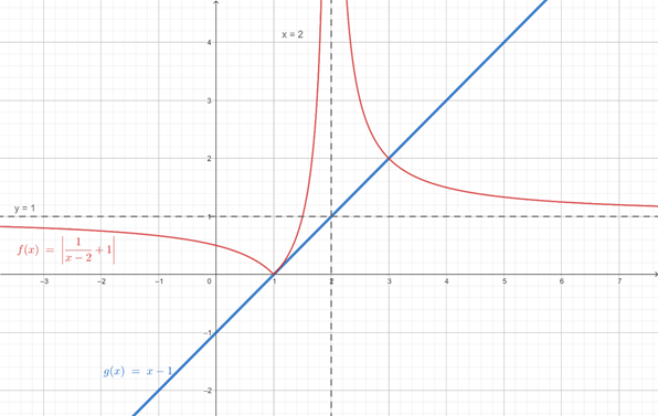 , aby znaleźć asymptoty funkcji. Zacznij rysowanie od funkcji a/x, następnie przesuń o wektor, a na koniec zrób wartość bezwzględną z całej funkcji. Odczytaj z wykresu argumenty, dla których funkcja f jest większa od funkcji g.