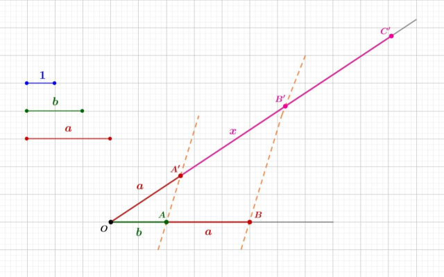 Sporządź odcinki o długościach 1, a, b (a > b), a następnie narysuj odcinek o długości