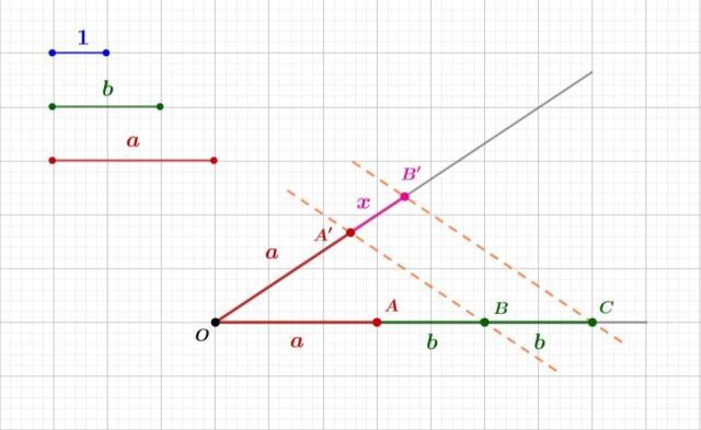 4.Poprowadź prostą przechodzącą przez punkty B i A’ (końce odcinków a+b i a).
