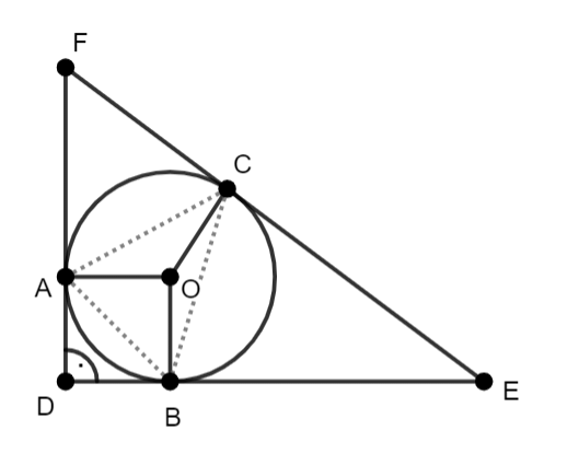 W tym zadaniu zauważ, że kąt AOB jest równy 90°, ponieważ figura AOBD to kwadrat o boku równym długości promienia wpisanego w ten trójkąt. Skorzystaj z własności kąta wpisanego i kąta środkowego, które są oparte na tym samym łuku.