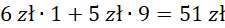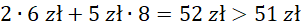 Rozważ przypadki dla różnych ilości losów zielonych. Jeżeli losów zielonych nie było, to jedyna możliwość uzyskania sumy 51 zł to zakup trzech losów czerwonych i sześciu losów białych. W tym przypadku ilość losów nie sumuje się do 10, więc odrzuć tę opcję. Jeżeli był tylko jeden los zielony, to warunki zadania są spełnione dla dodatkowo zakupionych dziewięciu losów białych. Zauważ, że jeżeli losów zielonych byłoby 2 lub więcej to minimalna zapłata za całość wynosiłaby 52 zł (rozważamy przypadek, gdy osiem pozostałych losów to losy najtańsze – białe), a więc nie jest możliwe, aby pan Wojciech kupił więcej niż 1 los zielony.