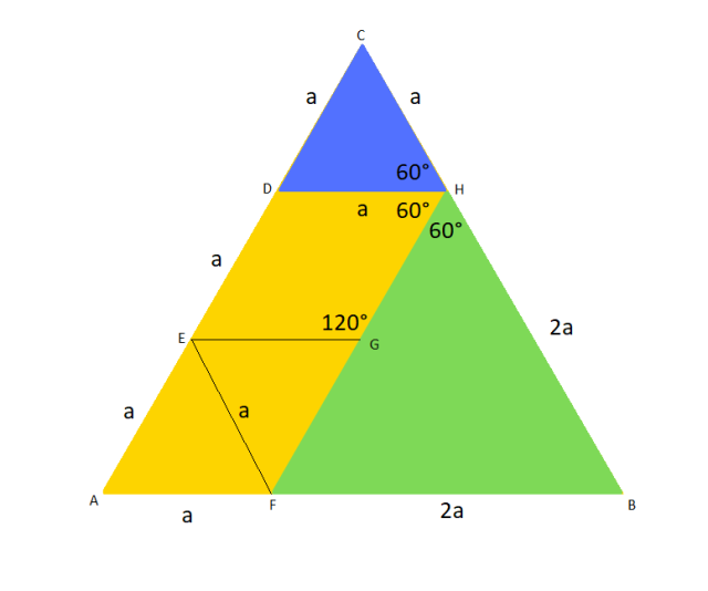 Jeśli kąty CHD, DHG i FHB razem dają kąt półpełny o mierze 180°, a kąty DHC i FHB to kąty w trójkątach równobocznych, czyli mają po 60°, to kąt DHG też ma 60°. W rombach kąty przy jednym boku dają w sumie 180°, czyli romb AFGE oraz romb EGHD mają kąty 60° i 120°. Przekątne rombu to dwusieczne jego kątów, czyli przekątna EF podzieliła kąt AEG o mierze 120° na dwa kąty po 60°. Podzieliła zatem cały romb na dwa przystające trójkąty równoboczne o boku równym bokowi trójkąta DHC, czyli ten romb ma dwukrotnie większe pole od małego trójkąta. Trójkąt równoboczny FBH jest większy i jego bok ma długość równą dwóm długościom małego trójkąta. Pole większego trójkąta jest zatem czterokrotnie większe od małego trójkąta, czyli dwukrotnie większe od pola rombu.