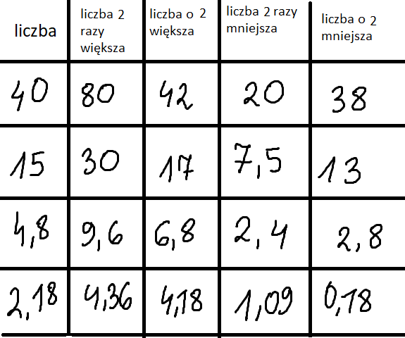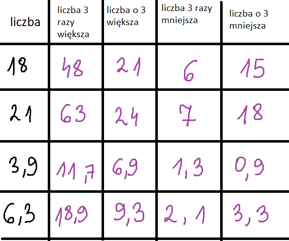 Aby obliczyć liczbę 3 razy większą, musisz pomnożyć początkową liczbę przez 3. Aby obliczyć liczbę o 3 większą, musisz do liczby dodać 3. Aby obliczyć liczbę o 3 mniejszą, musisz od liczby odjąć 3. Aby obliczyć liczbę 3 razy mniejszą, musisz podzielić początkową liczbę przez 3.
