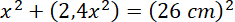 W trójkącie prostokątnym jedna z przyprostokątnych jest 2,4 razy dłuższa niż druga. Przeciwprostokątna ma długość 26 cm. Oznacz długość krótszej przyprostokątnej jako x i Podstaw do twierdzenia Pitagorasa: