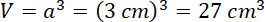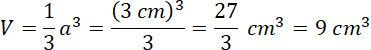 W sześcian o krawędzi 3 cm wpisano ostrosłup tak, że podstawy obu brył pokrywają się, a wierzchołek ostrosłupa znajduje się w jednym z górnych wierzchołków sześcianu. Ostrosłup ma w podstawie kwadrat. Oblicz jego objętość:
