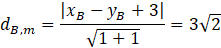 Najpierw z przecięcia dwóch prostych wyliczamy punkt A. Następnie liczymy odległość punktu B od prostej AC, kolejno wstawiamy otrzymane dwa przypadki do prostej AB i obliczamy współrzędne punktu