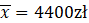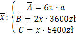 Wyznacz średnie wynagrodzenie osób pracujących w oddziale A, wiedząc, że w całej firmie średnia zarobków wynosi 4400 zł, w oddziale B – 3600 zł, gdzie pracuje trzy razy mniej osób niż w oddziale A. Natomiast oddział C ma dwa razy mniej osób niż oddział B, a ich średnia zarobków wynosi 5400 zł.
