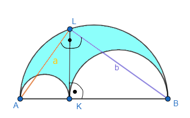 Na średnicy AB wybrano punkt K i narysowano dwa półkola o średnicach AK i KB (jak na rysunku). Udowodnij, że pole zacienionej figury jest równe polu koła, którego średnicą jest odcinek KL, prostopadły do średnicy AB.