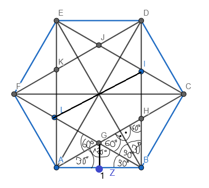W sześciokącie foremnym ABCDEF o boku długości 1, krótsze przekątne przecinają się w punktach G, H, I, J, K, L (zgodnie z rysunkiem). Wykaż, że sześciokąt GHIJKL również jest foremny. Oblicz długość boku tego sześciokąta.
