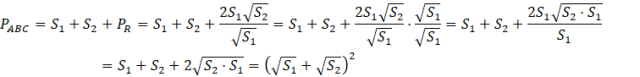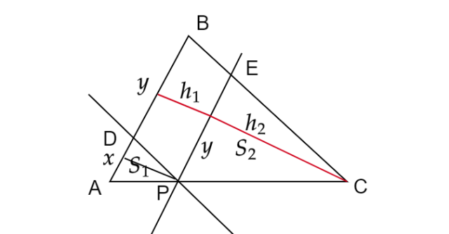 Zauważ, że wszystkie trzy trójkąty są podobne, bo mają takie same kąty. Wyznacz skalę podobieństwa między trójkątami powstałymi po podziale. Wysokość równoległoboku jest taka sama jak wysokość mniejszego z tych trójkątów, a bok równoległoboku, na którą ta wysokość pada jest taka sama jak jeden z boków drugiego trójkąta. Po kolei wyznacz: zależność boku równoległoboku od boku mniejszego trójkąta i pól trójkątów, zależność wysokości równoległoboku od pola