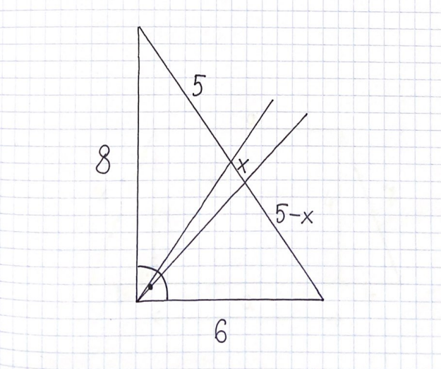 W tym zadaniu oblicz jakie długości mają odcinki, które dzielą przeciwprostokątną trójkąta prostokątnego na trzy odcinki wiedząc, że w tym trójkącie o bokach długości 6, 8, 10 z wierzchołka kąta prostego poprowadzono środkową i dwusieczną tego kąta.