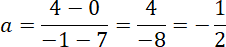 Z treści zadania wynika, że funkcja przecina oś x w punkcie OX = (7, 0) i do jej wykresu należy punkt (-1, 4). Oblicz współczynnik kierunkowy funkcji, która przechodzi przez punkty