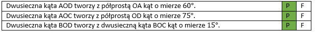 Podano miary kątów między półprostymi OA, OB., OC, OD. Oceń prawdziwość podanych zdań. Wybierz P, jeśli zdanie jest prawdziwe, lub F – jeśli jest fałszywe.