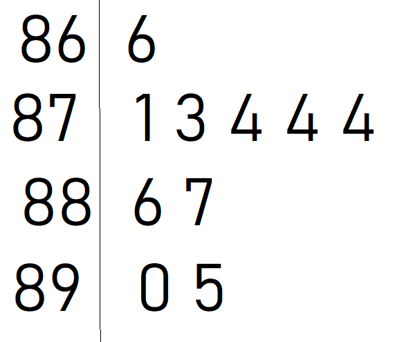 W tym zadaniu musisz przedstawić wyniki skoku w dal w postaci diagramu łodygowo-listowego, jeśli wiadomo, że wyniki najlepszych zawodników wszech czasów w skoku w dal mężczyzn to: 895, 890, 887, 886, 874, 874, 874, 873, 871, 866.