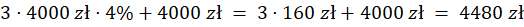 Lokata jest oprocentowana 4% rocznie. Klient skorzystał z niej trzy razy – za pierwszym razem wpłacił kwotę 4000 zł, a za kolejnymi całą dostępna kwotę wraz z odsetkami. Ile oszczędności zgromadził w 3 lata? O ile mniej by zaoszczędził, gdyby co roku wpłacał po 4000 zł?