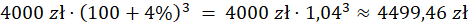 W pierwszej sytuacji w każdym roku kwota na lokacie powiększała się o 4%, a zatem wynosiła 1,04 razy kwota w roku poprzednim. Wartość po 3 latach można więc obliczyć jako