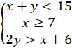 Wyznacz ilość zadań zamkniętych i otwartych na klasówce, jeśli klasówka składa się z mniej niż 15 zadań, z czego co najmniej 7 z nich to zadania otwarte. Ponadto zachodzi: podwojona liczba zadań zamkniętych jest większa od powiększonej o 6 liczby zadań otwartych.