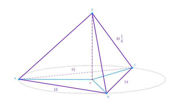Dany jest ostrosłup prosty o podstawie z pewnego trójkąta. O tej podstawie wiadomo, że długości jej boków wynoszą: 13 cm, 14 cm oraz 15 cm. Wiedząc, że krawędź boczna bryły ma długość równą