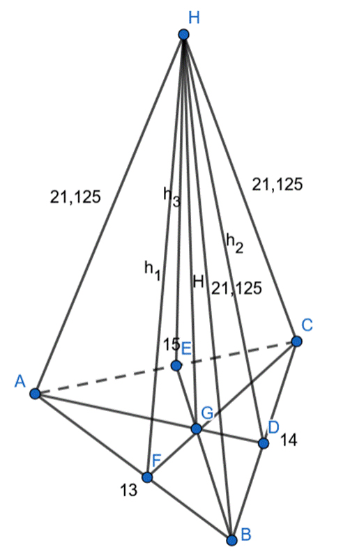 Wyznacz objętość ostrosłupa, którego podstawą jest trójkąt, którego boki mają długość 13 cm, 14 cm, 15 cm i wszystkie krawędzie boczne mają taką samą długość, równą