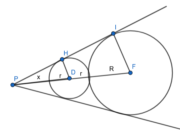 Wyznacz promienie tych okręgów, jeśli wiadomo, że odległość punktu P od jednego ze środków okręgów wynosi 6 cm, a od drugiego – 14cm, jeśli dwa okręgi styczne zewnętrznie wpisano w kąt o wierzchołku P.