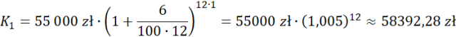 Na lokatę o sześcioprocentowym w skali roku oprocentowaniu ojciec Zuzanny wpłacił 55 000 zł. Z kapitalizowanych co miesiąc odsetek ma być przelewane 200 zł kieszonkowego na konto jego córki. Oblicz, o ile więcej pieniędzy mogłoby znaleźć się na koncie ojca, jeśli nie wypłacano by tego kieszonkowego.