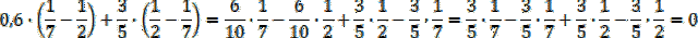 Zauważ, aby uniknąć sprowadzania ułamków w nawiasach do wspólnego mianownika, zapisz mnożenie każdej z tych liczb osobno (pozwala na to rozdzielność mnożenia względem dodawania). Teraz zwróć uwagę, iloczyn, który w jednym miejscu dodajemy (nie musisz mnożyć tych ułamków), chwilę później odejmujemy, czyli niezależnie od wartości tych iloczynów, różnica dwóch identycznych liczb zawsze jest równa zero.