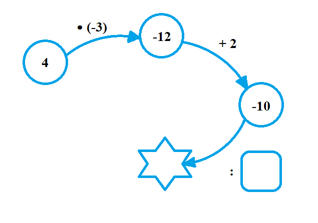 Wykonaj po kolei działania przedstawione w grafie. Zauważ, że nie istnieje liczba, po podzieleniu przez którą -10 da 0 (liczba w miejscu -10 musiałaby być równa 0).