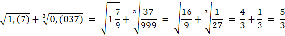 Zamień podane ułamki dziesiętne okresowe na ułamki zwykłe. Oblicz wartość pierwiastków i dodaj liczby do siebie.