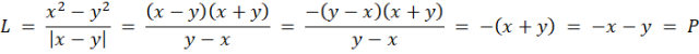 Zacznij przekształcenia od lewej strony równości. Rozpisz górę ułamka ze wzoru skróconego mnożenia, a następnie opuść wartość bezwzględną, wykorzystując warunek x < y. Skróć y – x. Uprość wyrażenie.