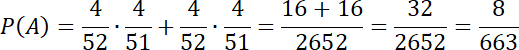 Wyznacz prawdopodobieństwo wylosowania jednej damy i jednego króla, jeśli z talii 52 kart losujemy kolejno dwa razy po jednej karcie bez zwracania.
