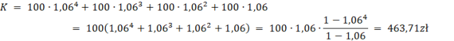 Paulina wpłacała na początku każdego roku po 100zł na konto z oprocentowaniem. 4% w skali roku. Kwotę zgromadzoną na koncie możemy obliczyć według wzoru: