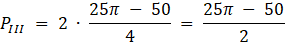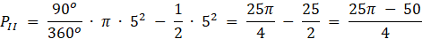 Figura przedstawiona na rysunku II to odcinek koła. Jego pole to różnica pól: wycinka koła o promieniu r = 5 utworzonego przez kąt 90o i trójkąta prostokątnego równoramiennego o ramieniu długości 5. Zatem: