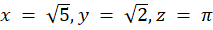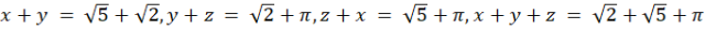 Należy podać takie trzy liczby niewymierne, by suma ich trzech była niewymierna i sumy każdych dwóch niewymierne.