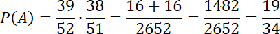 Wyznacz prawdopodobieństwo wylosowania dwóch kart, które nie są kierami, jeśli z talii 52 kart losujemy kolejno dwa razy po jednej karcie bez zwracania.