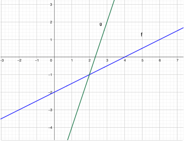 W tym zadaniu musisz w jednym układzie współrzędnych narysować funkcje f i g. Następnie sprawdź dla jakich x funkcja f przyjmuje wartości większe od funkcji g, a dla jakich mniejsze.