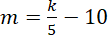 C. Aby obliczyć pewną liczbę m, podziel liczbę k przez 5 i odejmij 10 od otrzymanego ilorazu.