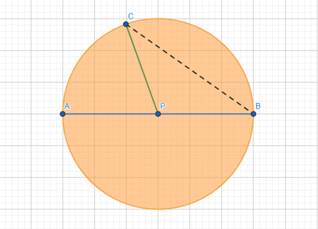Zaznacz w zeszycie punkt P i wbij w jego miejsce cyrkiel, którego nóżki są rozłożone na odległość 3 cm. Zatocz okrąg, my potrzebujemy koła, więc musisz jeszcze zamalować jego wnętrze. Teraz zastanówmy się, gdzie muszą znaleźć się podane punkty. Aby odcinek AB był średnią, musi on przechodzić przez środek koła, czyli punkt P, co oznacza, że punkt A oraz punkt B muszą znaleźć się po dwóch stronach okręgu (koniecznie muszą się znaleźć na obręczy koła, w innym przypadku nie będą jego średnicą), w linii prostej z punktem P. Z punktem C jest łatwiej, jego odległość od punktu P musi być równa promieniowi, a więc punkt C może znaleźć się w dowolnym miejscu na okręgu (gdy znajdzie się wewnątrz okręgu, jego odległość od środka będzie mniejsza od promienia). Teraz możesz połączyć ze sobą punkt B oraz C, zauważ, odcinek nie przechodzi przez środek koła, a więc nie jest to jego średnia. Pamiętaj, każdy odcinek łączący dwa punkty na okręgu, to cięciwa.