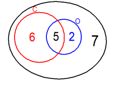 W tym zadaniu narysuj rysunek pomocniczy i zapisz w nim podane informację, kolorem szarym zaznaczono iloczyn zbiorów C i O (cukierki czekoladowe z orzechami). Liczby oznaczają ilość elementów w odpowiednich zbiorach. Na koniec ustal liczbę elementów podanych zbiorów. Pamiętaj, że wyznaczając sumę zbiorów do elementów pierwszego zbioru, dopisz elementy drugiego zbioru, które nie występują w pierwszym zbiorze.