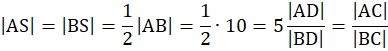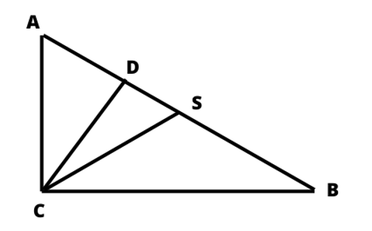 Zauważ, że CD jest dwusieczną kąta prostego, a CS jest środkową poprowadzoną naprzeciw prostokątną. Skorzystaj z tego, że punkt S jest środkiem boku AB i oblicz długość odcinka AS. Skorzystaj następnie z twierdzenia o dwusiecznej i wyznacz długość DS. Mając te informacje oblicz długość odcinka AD jako różnica długości odcinków AS i DS.