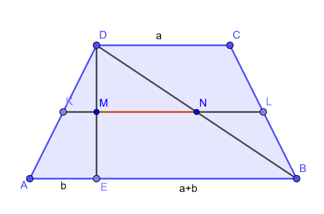 W trapezie równoramiennym ABCD punkty K i L są środkami ramion AD i BC. Odcinek KL przecina wysokość DE trapezu w punkcie M i przekątną DB w punkcie N.