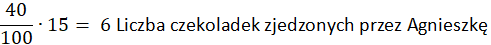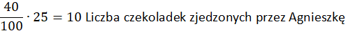 Aby obliczyć, ile czekoladek zjadł Anek, należy określić, ile wynosi 40% z liczby 25. Następnie należy odjąć uzyskaną wartość od liczby czekoladek znajdujących się początkowo w pudełku. Następnie należy określić, ile czekoladek zjadła Agnieszka, obliczając 40% z liczby pozostałych w pudełku czekoladek. Wynik ten należy odjąć od liczby czekoladek pozostałych w pudełku.