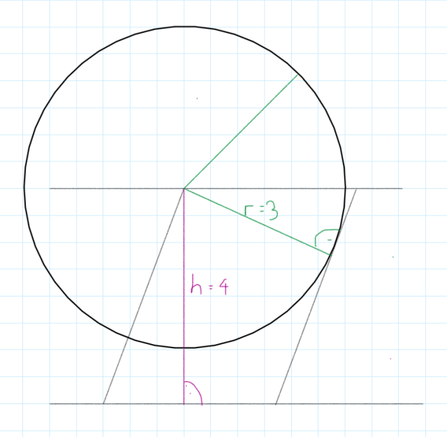 Narysuj dwie proste równoległe do siebie odległe o 4 cm. Następnie połącz je dowolnym nieprostopadłym odcinkiem. W jednym z punktów przecięcia narysuj okrąg o promieniu 3 cm używając cyrkla. Ostatni odcinek poprowadź tak, aby był styczny do okręgu, jak na rysunku. W ten sposób powstaje szukany równoległobok.