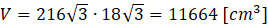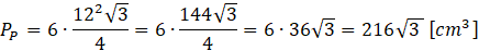 Podstawa graniastosłupa prawidłowego ma kształt sześciokąta foremnego, którego bok ma długość 12 cm. Pole powierzchni ściany bocznej tego graniastosłupa jest równe polu jego podstawy. Oblicz objętość tej bryły.