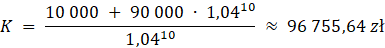 Gdyby opisana sytuacja miała trwać przez 10 lat, pan Jan wypłaciłby 100 000 zł, w tym ostatnia wypłata będzie równa 10 000 zł i analogicznie, jak wyżej, można zapisać równanie: