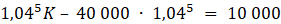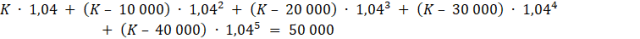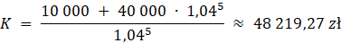 Przez pięć lat pan Jan wypłaci w sumie 50 000 zł przez pięć lat. Niech K będzie kapitałem, którym pan Jan obecnie dysponuje. Można zatem zapisać równanie: