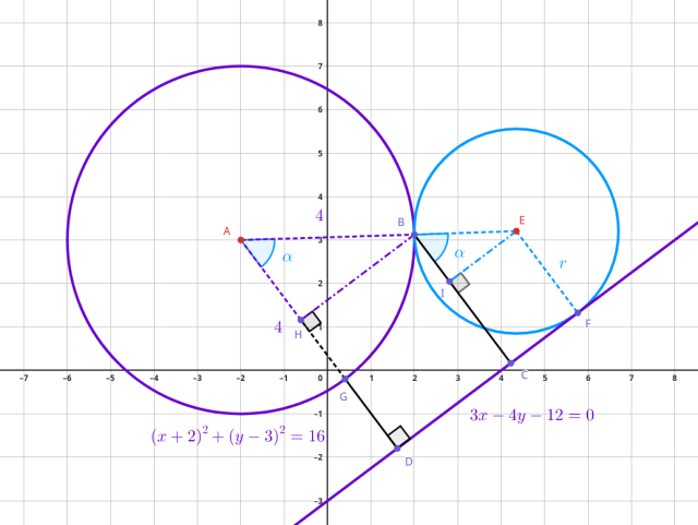 Niebieski okrąg to przykładowy okrąg styczny do prostej oraz okręgu. Poprowadź odcinek prostopadły z punktu 𝐴 do danej prostej, podobnie z punktu styczności okręgów oraz środka przykładowego okręgu. Połącz odcinkiem środki okręgów. Zawiera on punkt styczności okręgów. Oznacz kąt ∢𝐷𝐴𝐵 jako α oraz odcinek 𝐸𝐹 jako 𝑟.